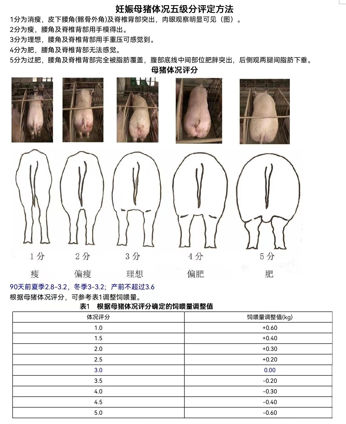 精确饲喂的另外一个主要目的是根据个体母猪胖瘦进行单个调量,以实现最佳分娩前体况、最大PSY,应根据下表原则在一轮妊娠饲喂周期执行5次调整操作: