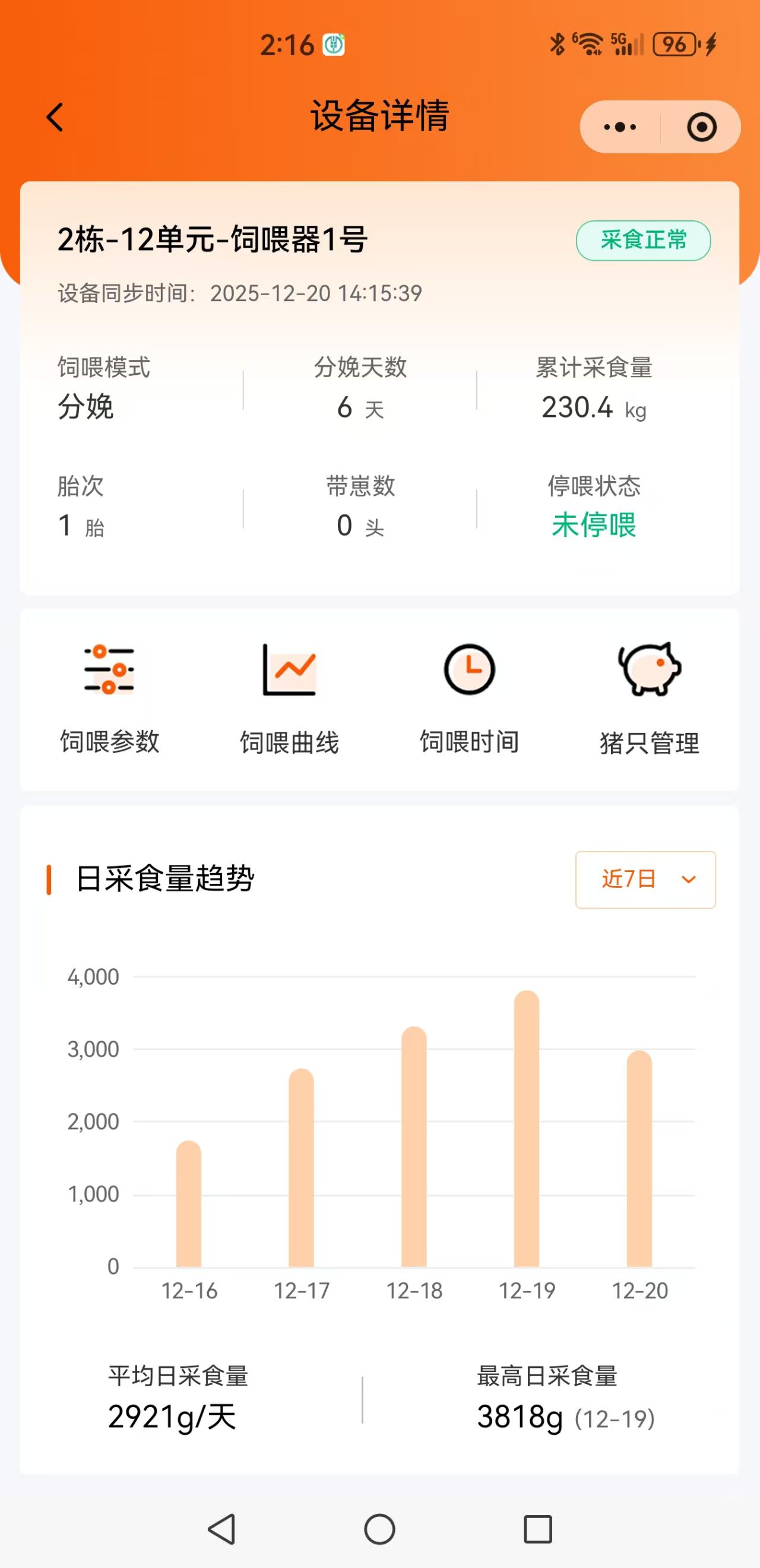 1. 疾病早期发现:通过对我司饲喂设备自动收集的实际采食记录,发现采食不正常之后通过网关向服务器发出“疾病早期疑似”关注。定位异常猪的栏位或者异常的群养小圈,使管理者能派人到达定位猪圈,及时检查进行“拔牙”隔离处理。